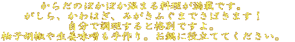 和食屋さんならではの丁寧な作業やちょっとしたコツやアレンジ。具入りにしたり、煮込み、美味しい隠し味を忍ばせて・・・等々。ヘルシーにも作ることができますよ。